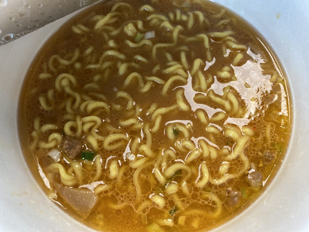 見てください、この湯気立つカップ麺!細麺に、たっぷりのスープが絡んでいて、見た目からしてホッと安心できます。具材も程よく入っていて、まさに「シンプル・イズ・ベスト」な一品です。