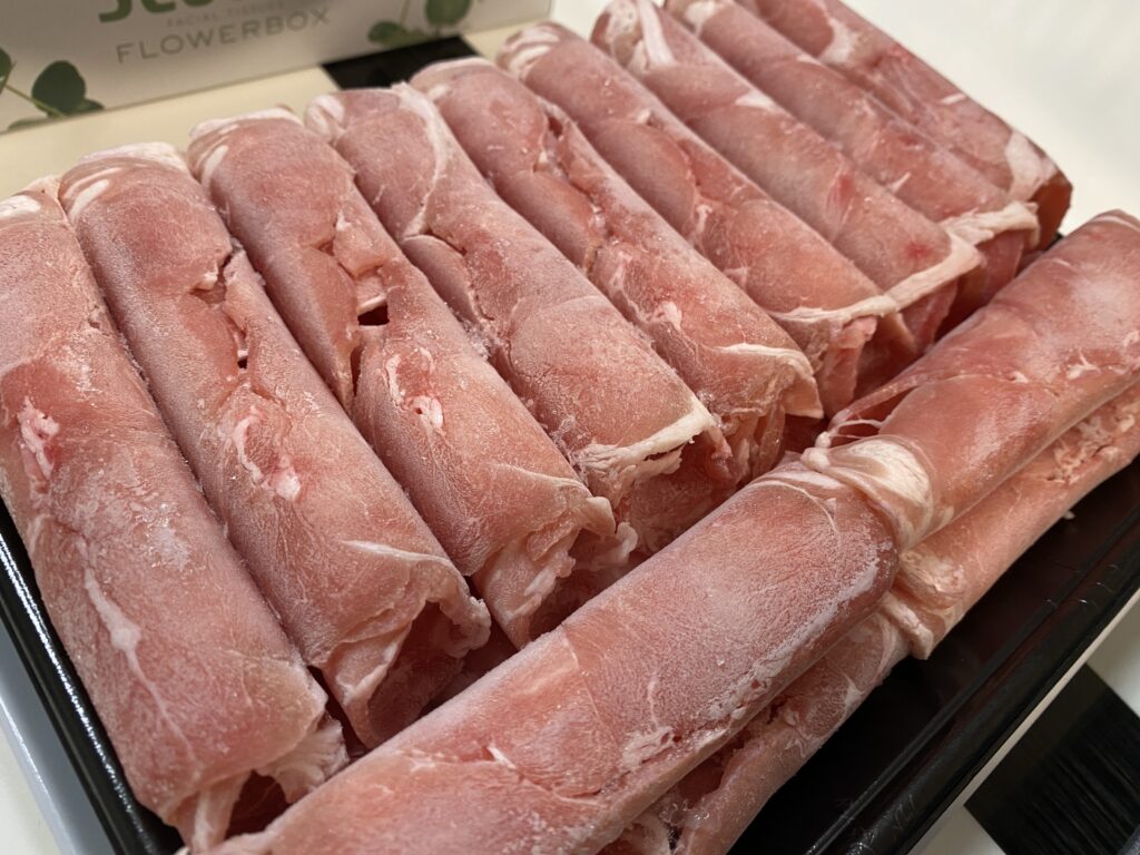 見てください、この美しいラム肉の薄切り!きれいに巻かれていて、見るからに新鮮さが伝わってきます。これを今回は「ラムしゃぶ」にしていただきました!